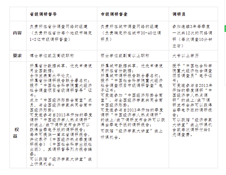 中国社会科学院是国家哲学社会科学研究的最高学术机构、党中央国务院的思想库智囊团。为更好“读懂中国”,中国社会科学院每年在全院设立2-3项重大经济社会调查项目。重大经济社会调查项目“中国经济形势与包容性绿色增长问题跟踪调查”课题由中国社会科学院工业经济研所李钢研究员主持,拟联合全国有志于共同推进此主题数据库建设与研究的同仁共同组建课题组。课题组拟面向全国293个地级市发放网络调查问卷,调查对象为在职人员;初步拟定在各城市遴选调研员30名左右,共约一万名调研员。2022年至2024年,每季度课题组统一通过手机、微信或电子邮件发放电子问卷(共12次)。