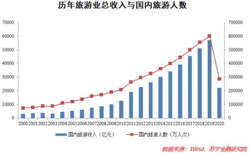 消费升级叠加政策支持的结果,便是旅游业快速的发展壮大。从数据上看,2019年我国旅游业总收入高达5.73万亿元,国内旅游人数60.06亿人次,且新世纪以来的绝大多数年份里,旅游业收入同比增速均高于GDP增速,还贡献了近8000万个就业岗位,对国民经济发展意义深远。不过在2020年,新冠疫情给旅游业带来了巨大冲击,行业也由此出现大幅度下滑,具体后面还会提到。