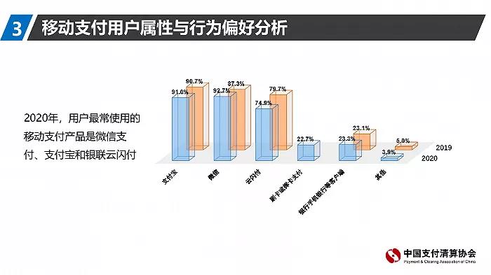 值得注意的是,在移动支付市场,支付宝和微信支付合计份额超过90%。而据中国支付清算协会今年年初发布的《2020年移动支付用户问卷调查报告》显示,2020年,微信取代支付宝,成为了用户最常使用的移动支付产品。