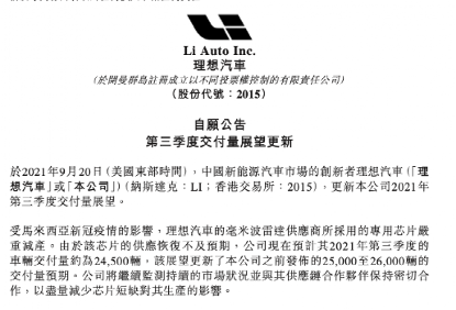 9月20日,理想汽车发布公告称,由于马来西亚的COVID-19大流行,公司毫米波雷达供应商专用芯片的生产受到严重阻碍。因为芯片供应的恢复速度低于预期,公司现在预计2021年第三季度的汽车交付量约为2.45万辆,此前预测的汽车交付量在2.5-2.6万辆。