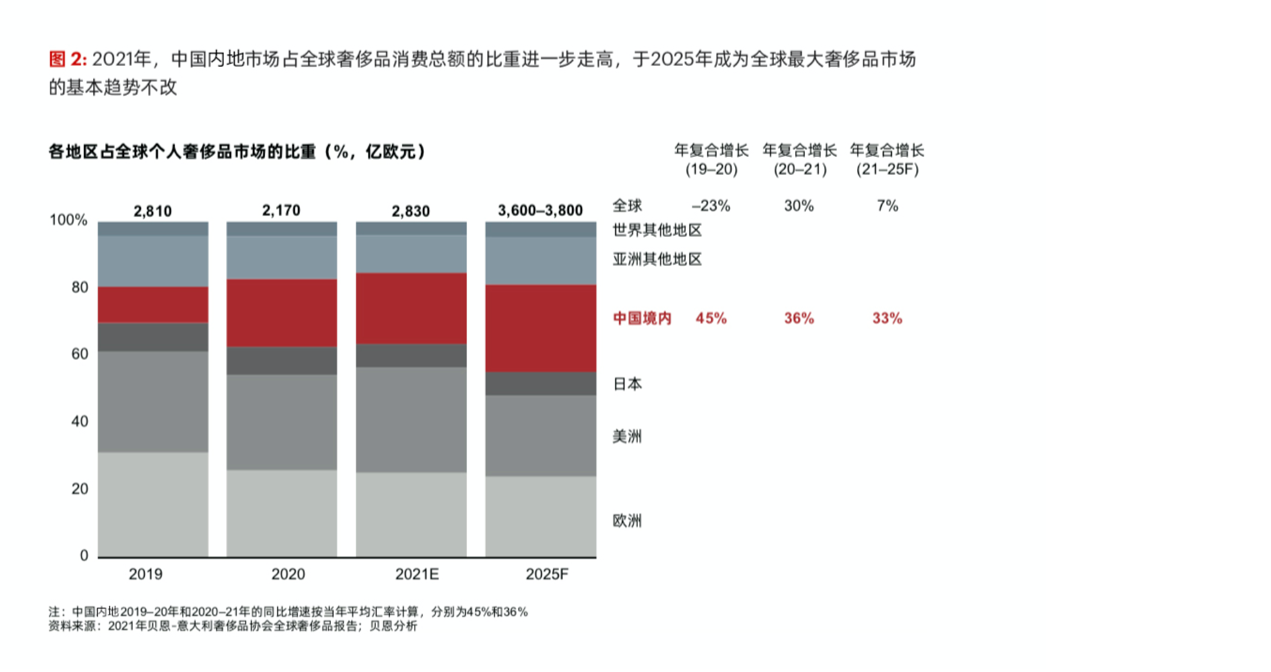 2020年,由于疫情导致出境游受阻,中国市场在中国消费者全球奢侈品消费中的占比达到70%至75%,创历史新高。2021年,得益于消费回流趋势的延续,该比例进一步上升至90%以上。