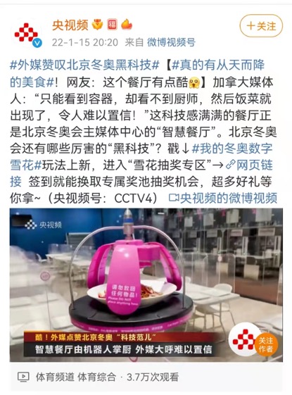 “这些饭菜是谁做出来的?我们只能看到砂锅之类的容器,却看不到厨师,然后饭菜就出现了,说实话,这项科技令人难以置信!”在2022年1月中旬中央电视台中文国际频道播出的《今日亚洲》节目里,一位加拿大媒体人对北京冬奥会主媒体中心的智慧餐厅表示赞叹。